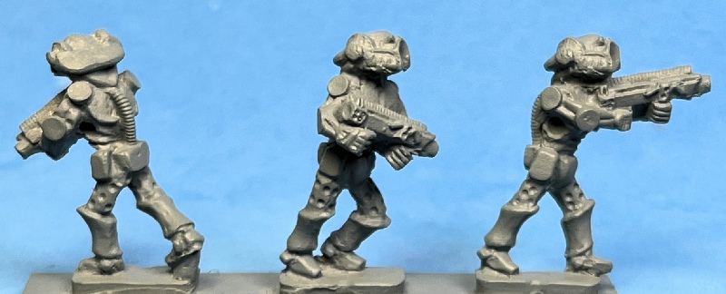 This range replaces the earlier 15mm sci fi range from Peter Pig. As with the old range, these figures are intended to be used with "The Company Rules" (TCR). TCR is also being updated to a second edition. The first edition was released in 1993. The figures are categorised as Praetorian (best), Legionary (middle) and Auxiliary (worst). Of course the very nature of science fiction gaming means that these figures can be used in any way wished. Quite right too. In the same manner players can use any figures they like for TCR games.