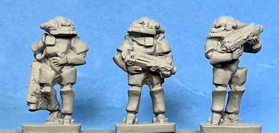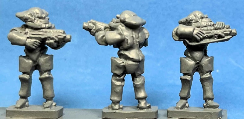 This range replaces the earlier 15mm sci fi range from Peter Pig. As with the old range, these figures are intended to be used with "The Company Rules" (TCR). TCR is also being updated to a second edition. The first edition was released in 1993. The figures are categorised as Praetorian (best), Legionary (middle) and Auxiliary (worst). Of course the very nature of science fiction gaming means that these figures can be used in any way wished. Quite right too. In the same manner players can use any figures they like for TCR games.