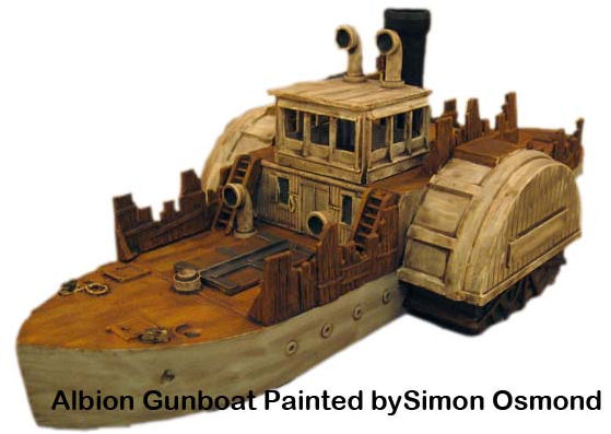 71. Paddle Boat ALBION "A nice big model" Gunboat By Julie includes. 1 Pack Naval gun crew. 1 Pack naval deck crew. Machine gun. Field Gun. 6 Palisades. 2 Large deck hatches. Removable top to wheelhouse. 12" Hull. 5" width. You will need some assembly skill as there are metal parts to be glued on.