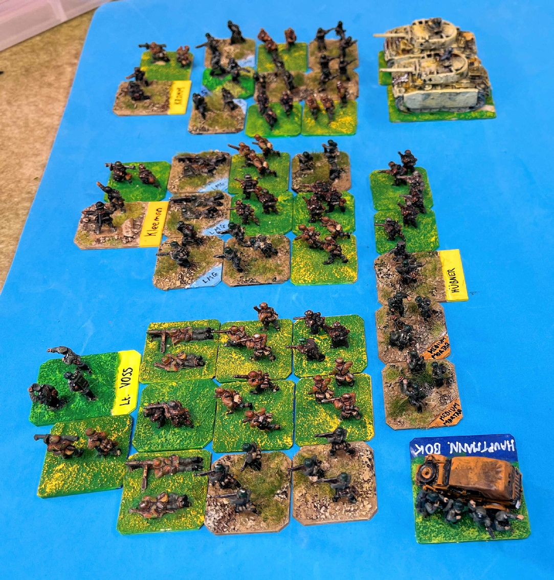 The game puts each player in command of a company. Typically this will be 3 platoons each of 12 bases. Added to this might be a support platoon and three tanks. Some players will use a foot only company. Such companies have an equal chance of success to a company with tanks.